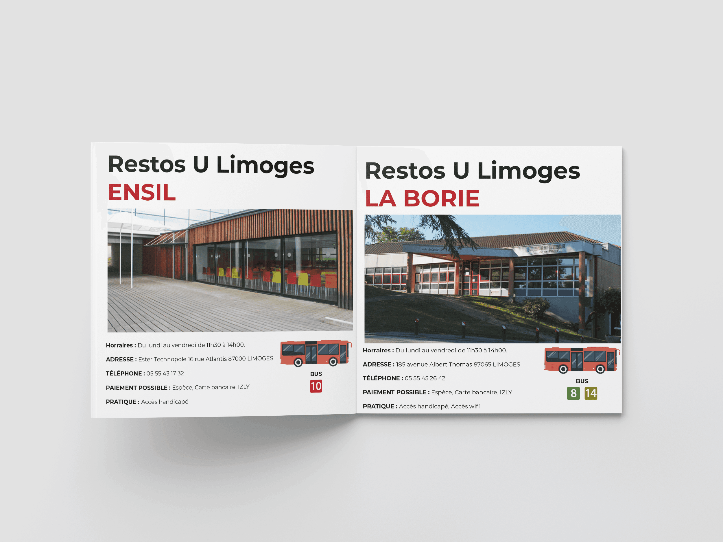 Dans le cadre d'un projet de design graphique, j'ai réalisé une brochure informative destinée aux étudiants pour les aider à mieux comprendre et utiliser les restaurants universitaires du Crous de Limoges . Ce guide a été conçu pour être clair, attractif et pratique , en facilitant l'accès aux informations essentielles (horaires, localisation, fonctionnement, tarifs, etc.).